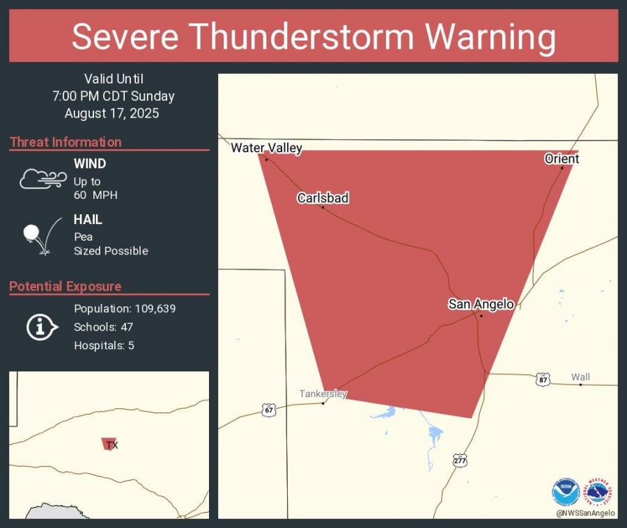 SAN ANGELO, TX – The National Weather Service issued a Severe Thunderstorm Warning for northeastern Tom Green County, including San Angelo, until 7 p.m. Sunday.