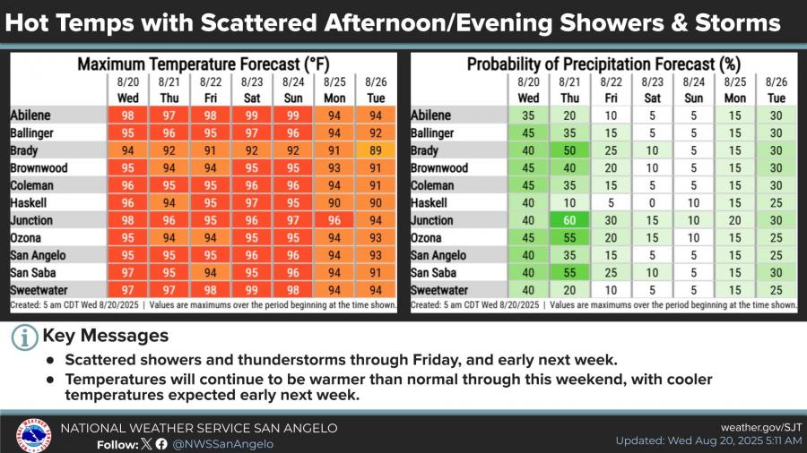 Rain chances are highest Wednesday and Thursday, with probabilities between 35 and 60 percent depending on location. Areas including Brady, Ozona, San Saba, and Junction have the greatest likelihood of storms. Chances decrease heading into the weekend but return early next week, paired with slightly cooler temperatures.