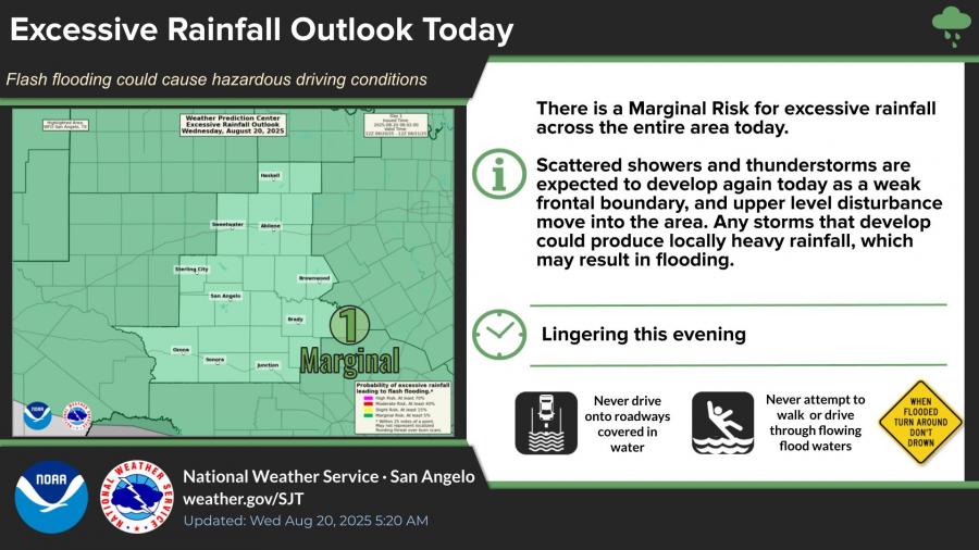 Forecasters released a marginal risk for excessive rainfall across the entire region Wednesday as a weak frontal boundary and upper-level disturbance move into West Central Texas. Any storms that develop could produce heavy downpours and gusty winds over 50 mph.