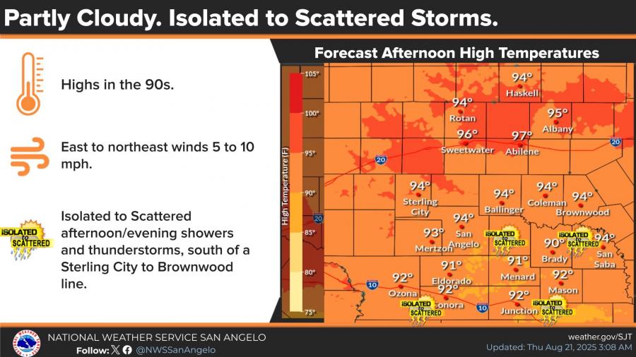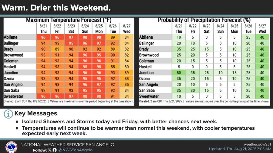 Temperatures will remain warmer than normal, with highs in the mid-90s for San Angelo through Sunday and upper 90s in Abilene. A shift in the pattern early next week will bring cooler conditions, with highs dropping into the 80s and rain chances climbing to 40 percent by Tuesday and Wednesday.