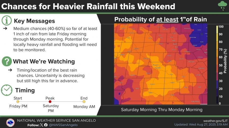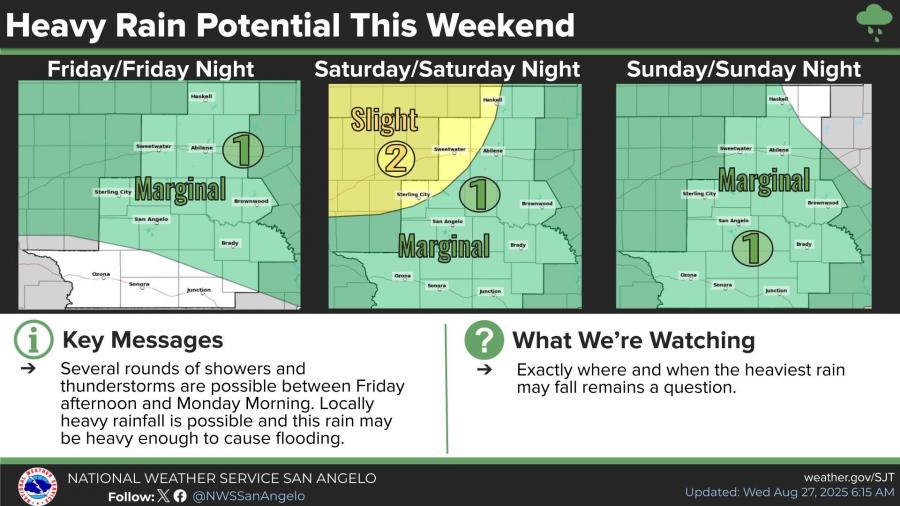 Forecasters say there is a medium chance—40% to 60%—that at least one inch of rain will fall across much of West Central Texas between late Friday morning and Monday morning. The Weather Prediction Center has issued a marginal risk of excessive rainfall for Friday and Sunday, with a slight risk for areas north of San Angelo on Saturday.