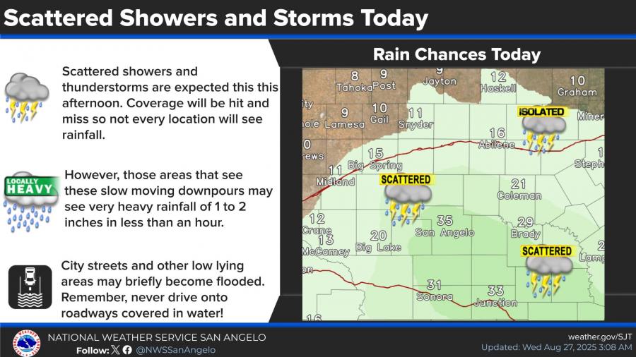 SAN ANGELO, TX — Scattered showers and thunderstorms are expected across West Central Texas today, with brief heavy downpours possible, the National Weather Service in San Angelo reports. Some storms could drop 1 to 2 inches of rain in less than an hour, leading to localized street flooding.