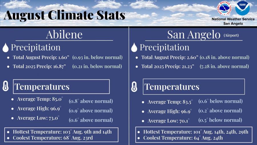 Temperature averages reflected the cooler trend. San Angelo’s August average temperature was 83.5 degrees, slightly below normal, while Abilene averaged 85 degrees, slightly above normal. San Angelo’s hottest day reached 101 degrees on Aug. 14, 24, and 29, while Abilene hit 103 degrees on Aug. 9 and 14. San Angelo’s coolest August temperature was 64 degrees on Aug. 24, while Abilene’s coolest was 66 degrees on Aug. 31.