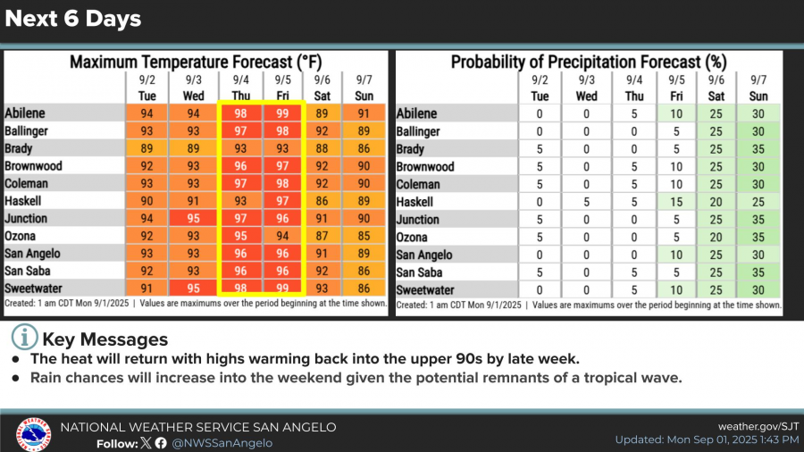 Near to above-normal temperatures are expected this week, with highs climbing back into the upper 90s by late week, according to the National Weather Service. Dry conditions are forecast through Friday, followed by increasing rain chances over the weekend as the potential remnants of a tropical wave move into the area.