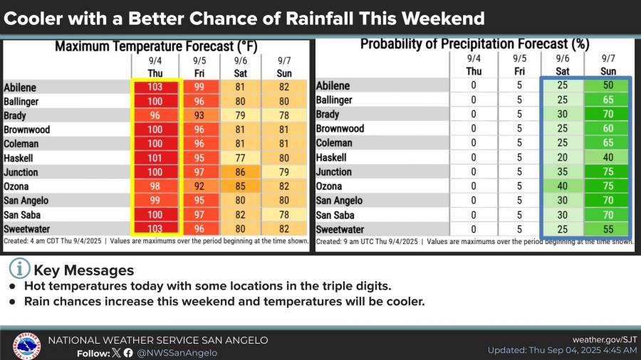 After peaking in the upper 90s and low 100s on Thursday, temperatures are expected to drop into the 80s by Saturday and Sunday. San Angelo’s high is forecast at 95°F on Friday, cooling to 80°F on both Saturday and Sunday. Overnight lows will dip into the mid to upper 60s through early next week.