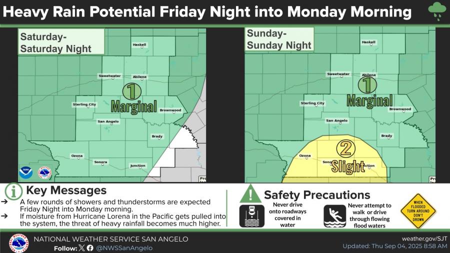 SAN ANGELO, TX — The National Weather Service is forecasting a chance of heavy rainfall and cooler temperatures across the Concho Valley beginning Friday night and continuing into Monday morning, as a cold front pushes into the area and may interact with tropical moisture from Hurricane Lorena.