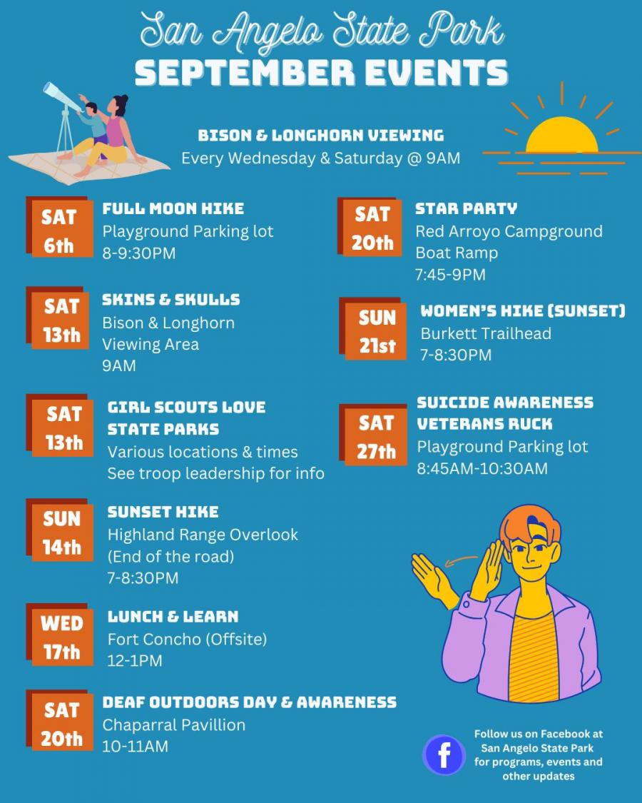 Additional events include a Lunch & Learn on Wednesday, Sept. 17, at Fort Concho from 12 to 1 p.m. and Deaf Outdoors Day & Awareness on Saturday, Sept. 20, at Chaparral Pavilion from 10 to 11 a.m.