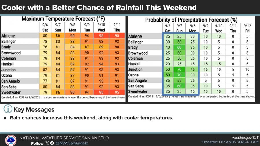 The chance of rain continues into Sunday, with San Angelo showing a 35% probability of precipitation on Saturday and a 55% chance Sunday. Temperatures will gradually warm into the upper 80s and low 90s by early next week.