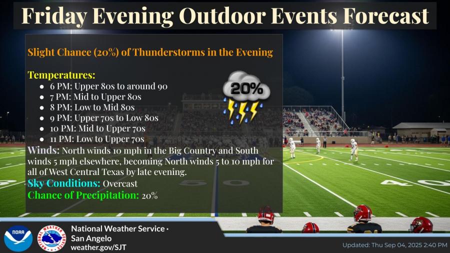 Temperatures on Friday will climb into the mid to upper 90s, with San Angelo forecast to reach 95°F.