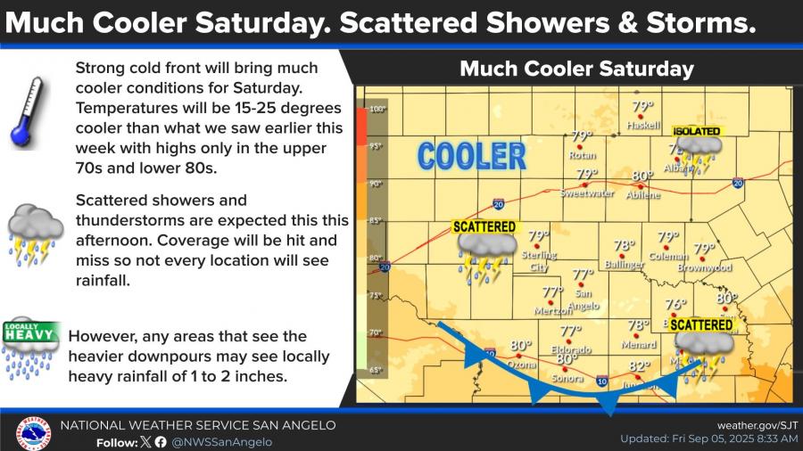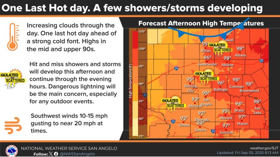 SAN ANGELO, TX — After one last hot day Friday, a strong cold front is expected to bring cooler temperatures and scattered storms to West Central Texas through the weekend, according to the National Weather Service in San Angelo.