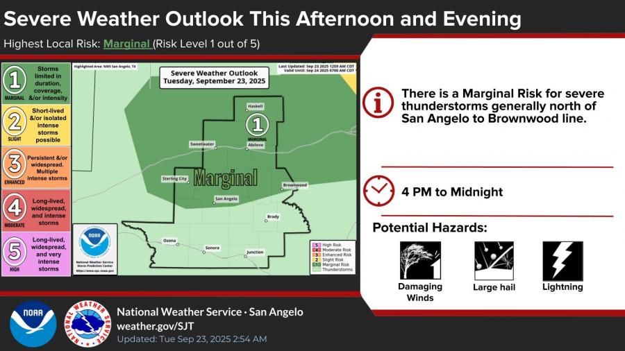 SAN ANGELO, TX — The National Weather Service in San Angelo is warning of a marginal risk for severe thunderstorms this afternoon and evening across areas generally north of a San Angelo-to-Brownwood line.