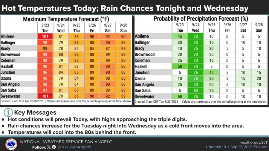 In addition to storm chances, the region will see another day of hot conditions. Highs Tuesday are expected to range from the mid-90s to 101 degrees across the Big Country and northwest Concho Valley, with San Angelo forecast to reach 98.