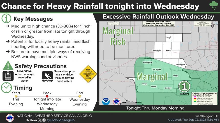 San Angelo and surrounding areas remain under a Marginal Risk for excessive rainfall through Wednesday evening, according to the Weather Prediction Center’s Excessive Rainfall Outlook. This level indicates a 5% chance or higher of flash flooding within 25 miles of any given point.