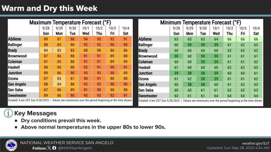 Highs are expected to climb into the mid to upper 80s on Sunday and Monday before reaching the lower 90s midweek. Forecast highs for cities across the region include 94 degrees in Abilene on Wednesday and 92 in San Angelo. Most areas will remain in the upper 80s to lower 90s through Saturday.