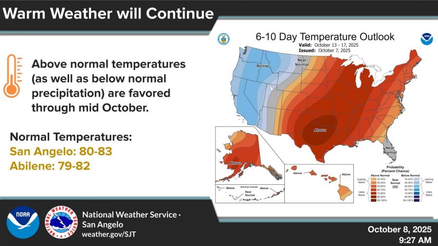 Normal temperatures for early to mid-October typically range from 80–83 degrees in San Angelo and 79–82 degrees in Abilene. The NWS says both cities are expected to remain several degrees above those averages for the next week.
