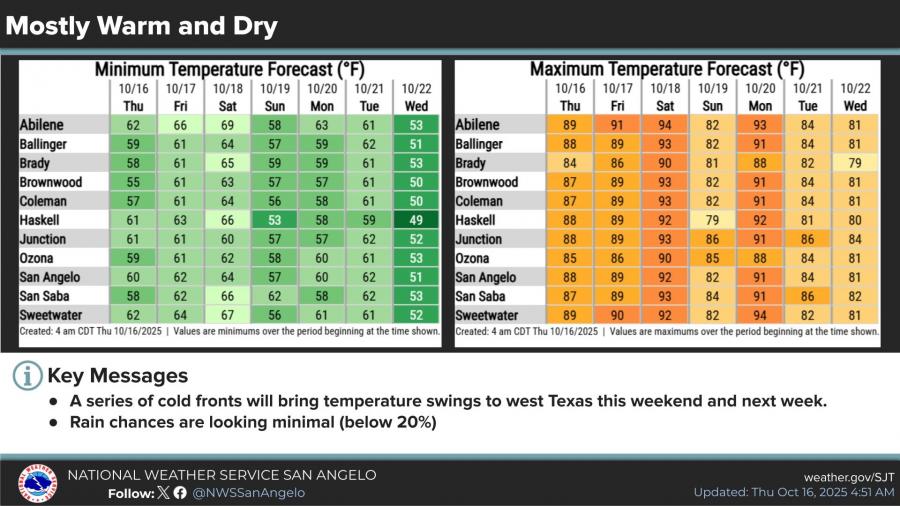 Highs in San Angelo are expected to stay in the upper 80s and low 90s through Monday before cooling into the lower 80s by midweek, with the exception of this Sunday, where the high is expected to be 82. Overnight lows will range from the upper 50s to low 60s, dipping into the low 50s by Wednesday. Despite the temperature shifts, rain chances remain minimal, with precipitation probabilities below 20% across the region.