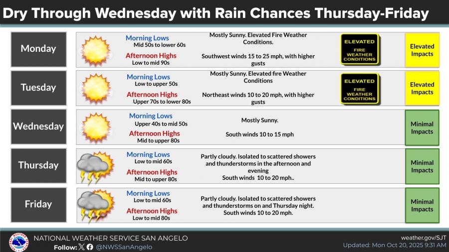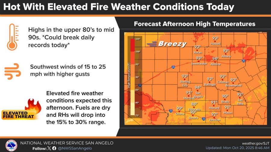 SAN ANGELO, TX — The National Weather Service in San Angelo is warning of elevated fire weather conditions across the Concho Valley and Big Country through Tuesday as near-record heat and gusty winds raise wildfire risks ahead of late-week rain chances.