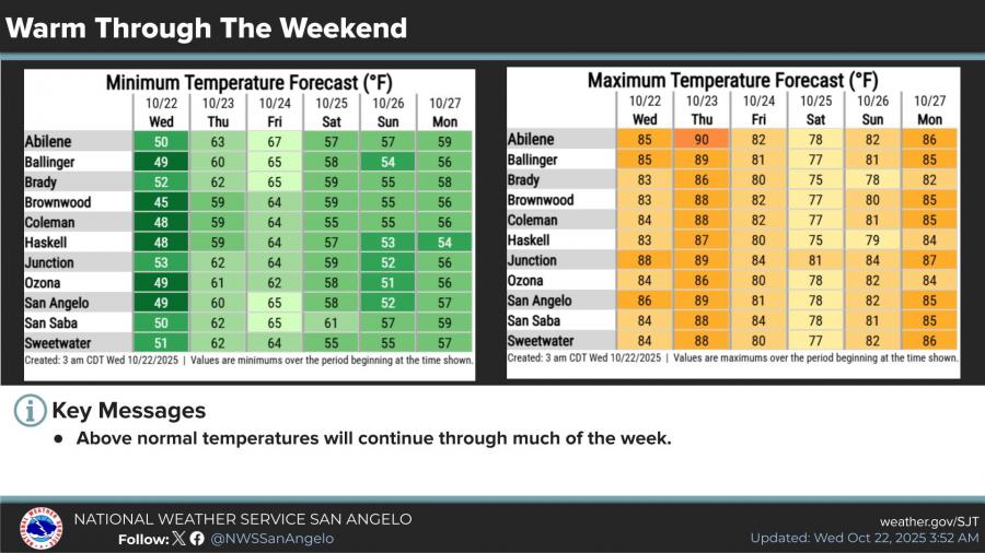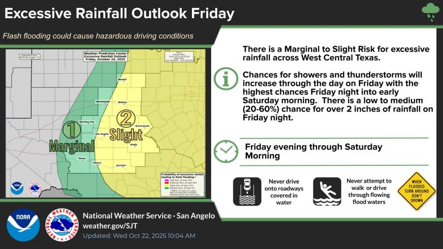 SAN ANGELO, TX — The National Weather Service in San Angelo is warning of the potential for heavy rainfall and strong thunderstorms across much of West Central Texas from Friday afternoon through early Saturday morning.