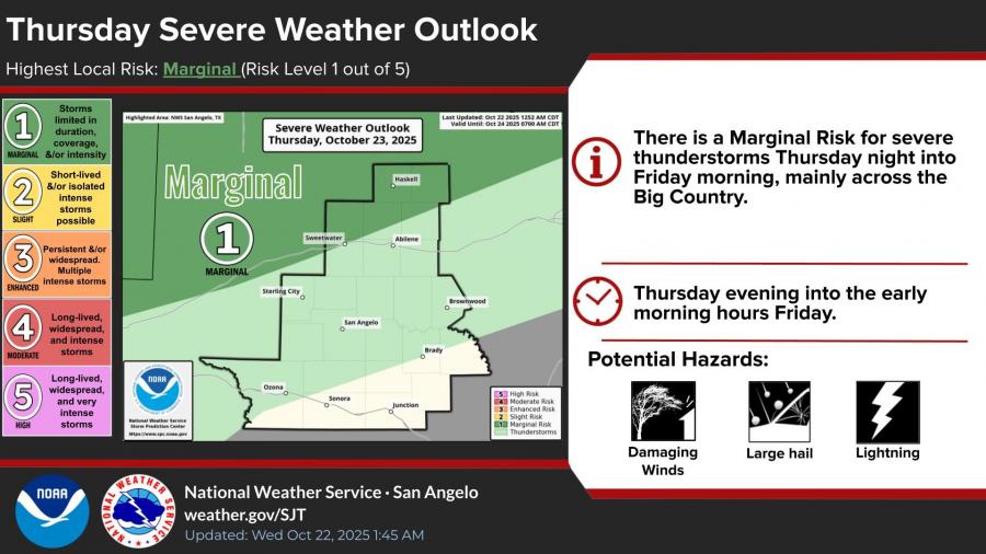A few strong storms are also possible Thursday night into early Friday, mainly north of San Angelo. Those storms could bring large hail and gusty winds before the main weather system arrives Friday.