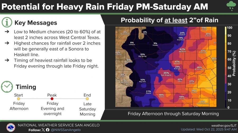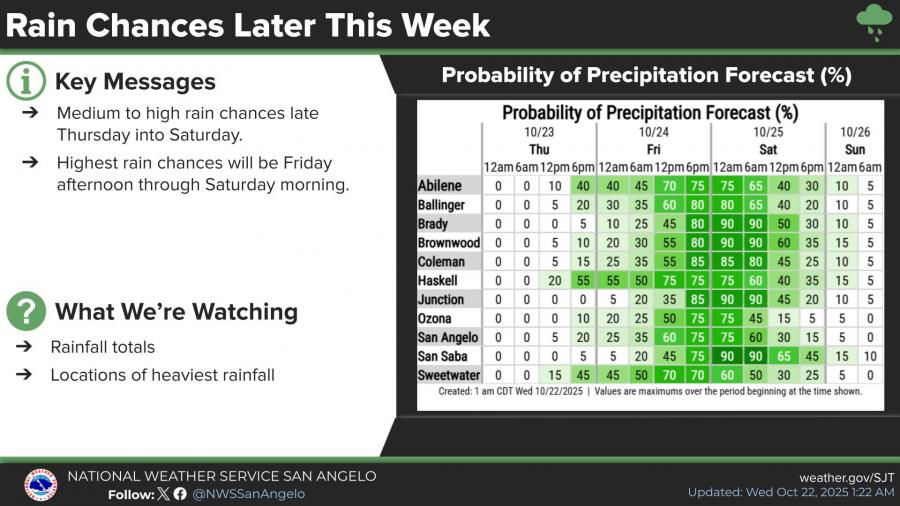 According to the NWS, the highest rain chances — between 70% and 90% — are expected from Friday afternoon through Saturday morning. Some areas could see 2 inches or more of rain, especially east of a Sonora-to-Haskell line.