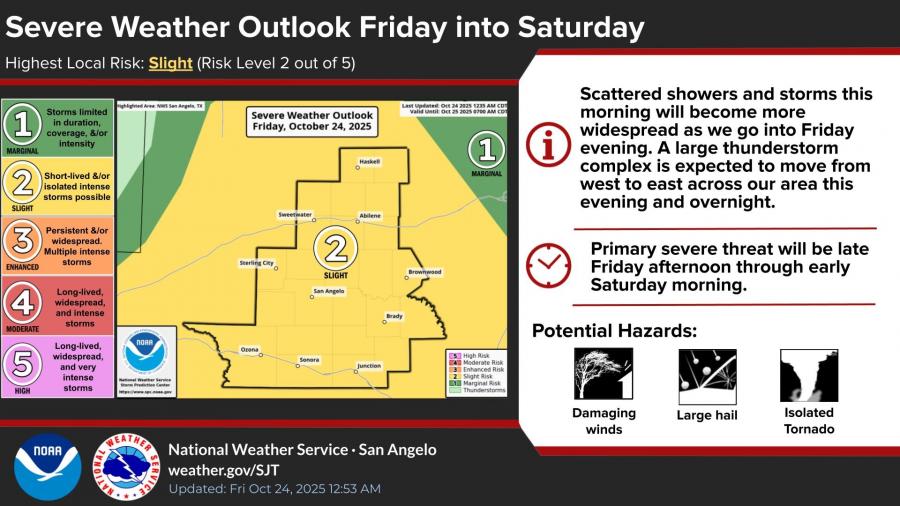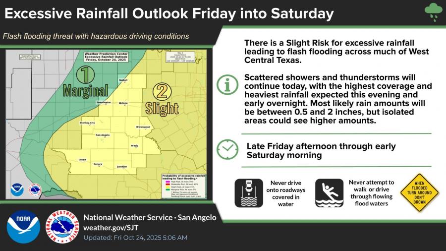 The NWS has placed San Angelo and surrounding counties under a Slight Risk (Level 2 of 5) for severe storms, along with a Slight Risk for excessive rainfall that could lead to flash flooding. Most areas are expected to receive 0.5 to 2 inches of rain, with isolated higher totals possible.