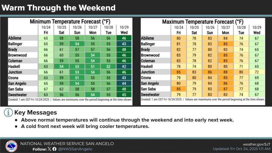 Temperatures will remain above normal through the weekend, with highs around 80 degrees and lows around 60 degrees. A cold front arriving early next week is expected to bring cooler weather by Tuesday and Wednesday.