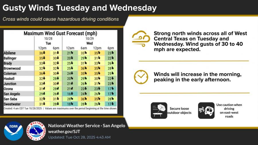 SAN ANGELO, TX — The National Weather Service in San Angelo is warning of strong north winds and sharply cooler temperatures this week as a cold front moves through West Central Texas.