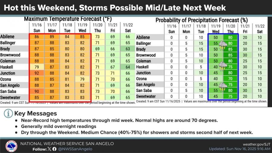 SAN ANGELO, TX — West Central Texas will see unseasonably warm weather through early week before rain and storm chances increase by the middle of this week, according to the National Weather Service in San Angelo.