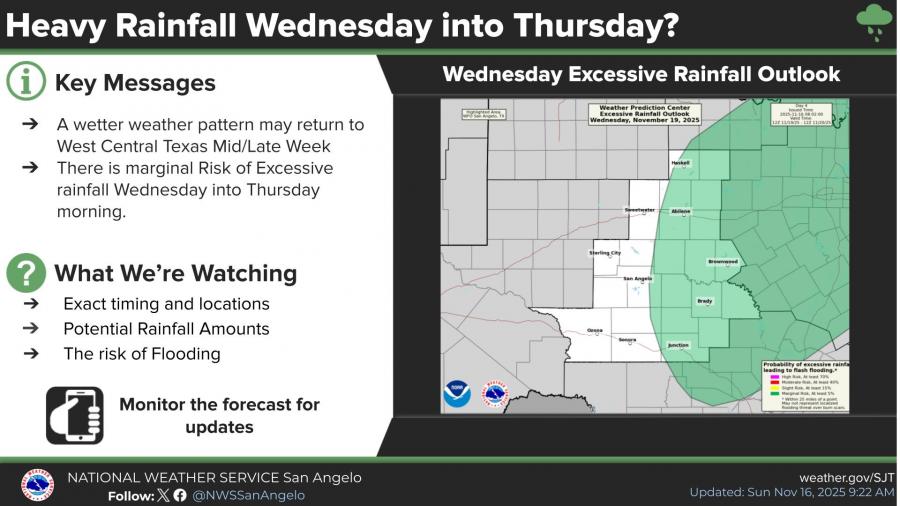 The Weather Prediction Center has issued a marginal risk for excessive rainfall from Wednesday into early Thursday, mainly for counties east of a line from Abilene to San Angelo to Sonora. Forecasters say it is still early, but rainfall amounts could reach 1 inch or more in some locations, with localized flash-flooding possible.