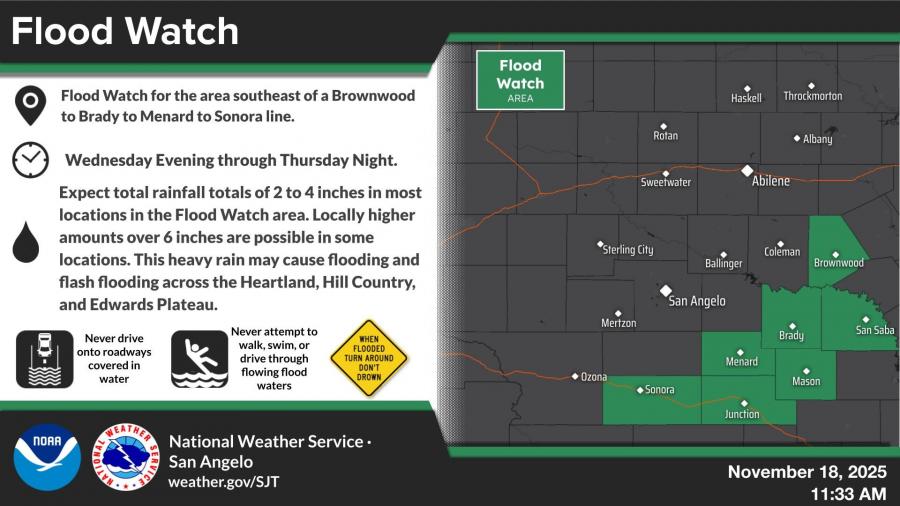SAN ANGELO, TX — The National Weather Service has issued a Flood Watch for areas southeast of a Brownwood-to-Brady-to-Menard-to-Sonora line, with heavy rainfall expected from Wednesday evening through Thursday night.