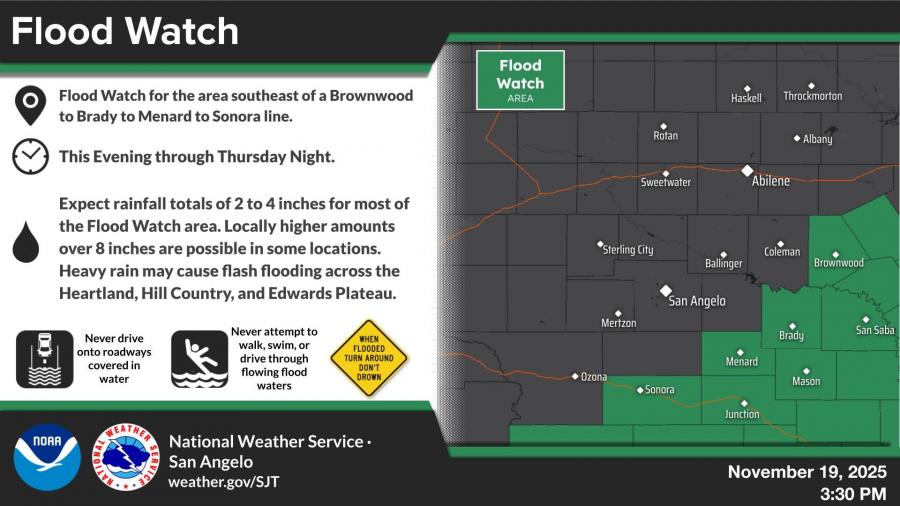 A Flood Watch remains in effect southeast of a Brownwood–to–Brady–to–Menard–to–Sonora line through Thursday night. Forecasters expected 2 to 4 inches of rain across the watch area, with isolated totals over 8 inches in some spots.