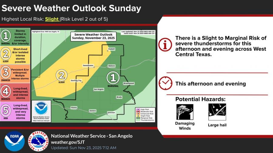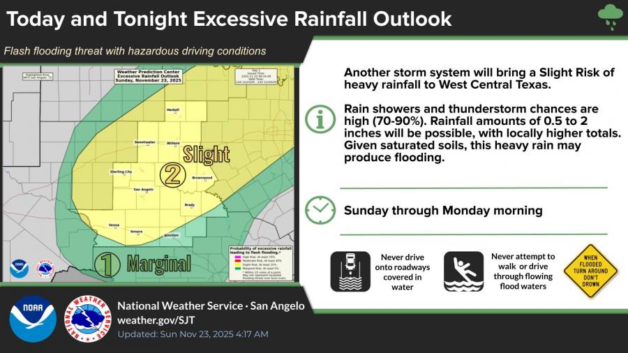 SAN ANGELO, TX — A Flood Watch goes into effect at 6 p.m. Sunday, with forecasters warning of heavy rainfall, flooding, and a slight risk of severe thunderstorms across San Angelo and West Central Texas through Monday morning, according to the National Weather Service.