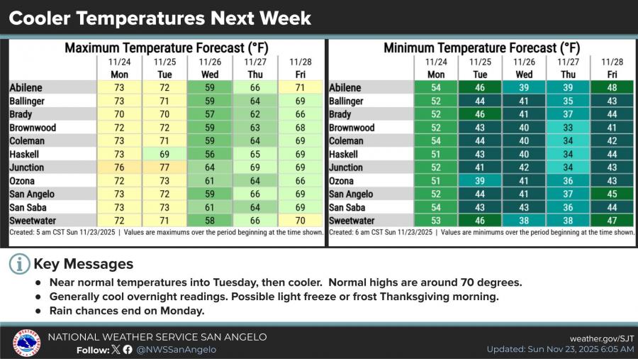 Temperatures will remain near normal early this week before turning cooler midweek. A light freeze or frost is possible Thanksgiving morning in parts of the region.