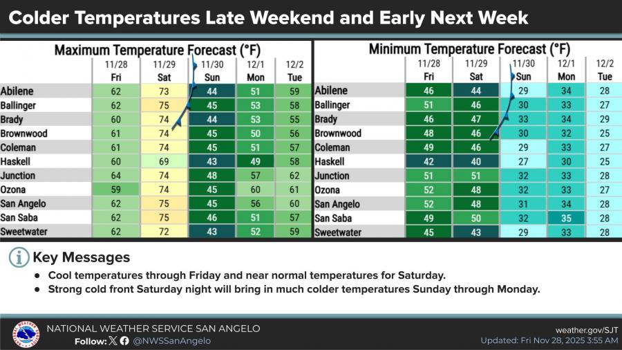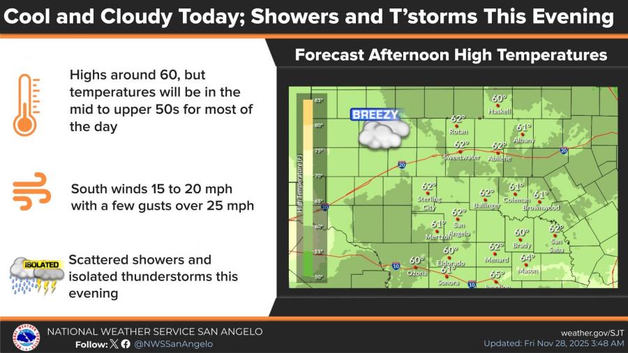SAN ANGELO, TX — Scattered showers and isolated thunderstorms are expected across the Concho Valley today before a powerful cold front brings freezing temperatures and bitter wind chills to the region by Sunday, according to the National Weather Service in San Angelo.