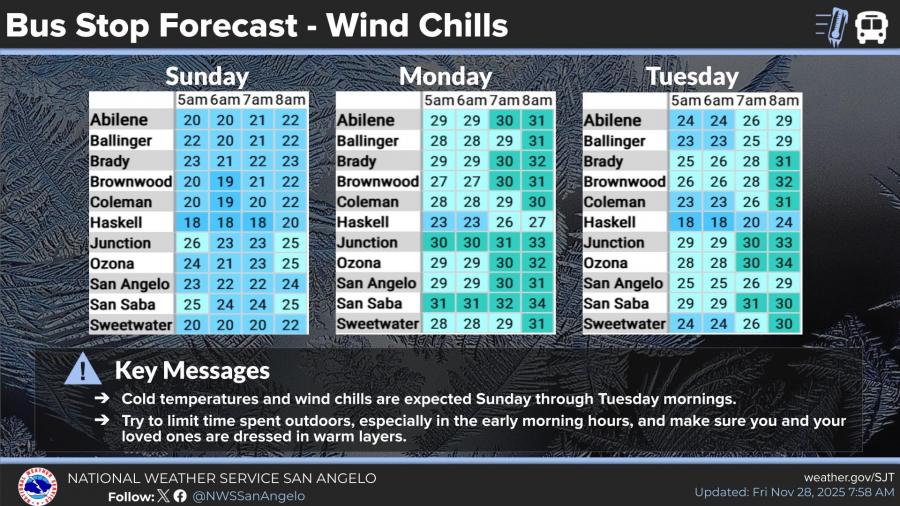 Wind-chill forecasts show San Angelo in the low 20s Sunday morning and mid-20s Monday and Tuesday mornings. The weather service advises limiting time outdoors during the early hours and ensuring children are dressed in warm layers for school.