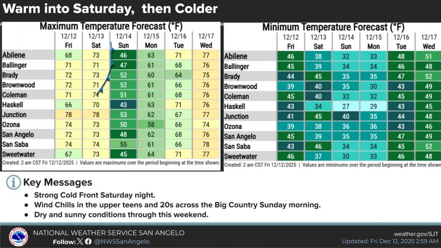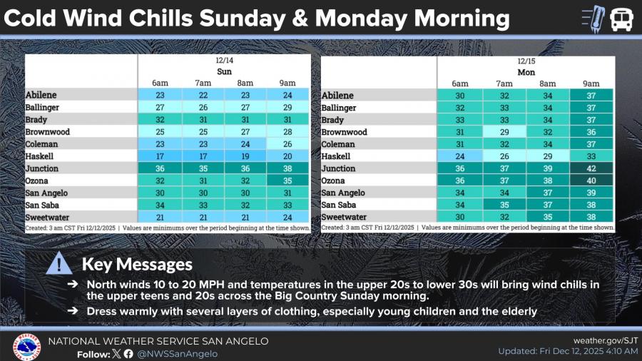 North to northeast winds of 10 to 20 mph behind the front will make conditions feel colder. Wind chill values Sunday morning are expected to range from the upper teens to the 20s across the Big Country, with San Angelo forecast to see wind chills near 30 degrees during the early morning hours.