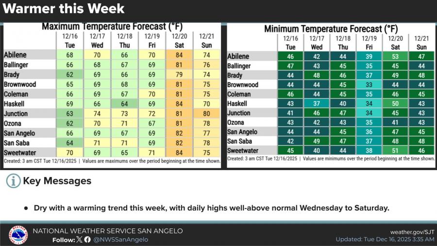 SAN ANGELO, TX — West Central Texas is expected to see a warming trend this week, with dry conditions and temperatures climbing well above normal through Saturday, according to the National Weather Service in San Angelo.