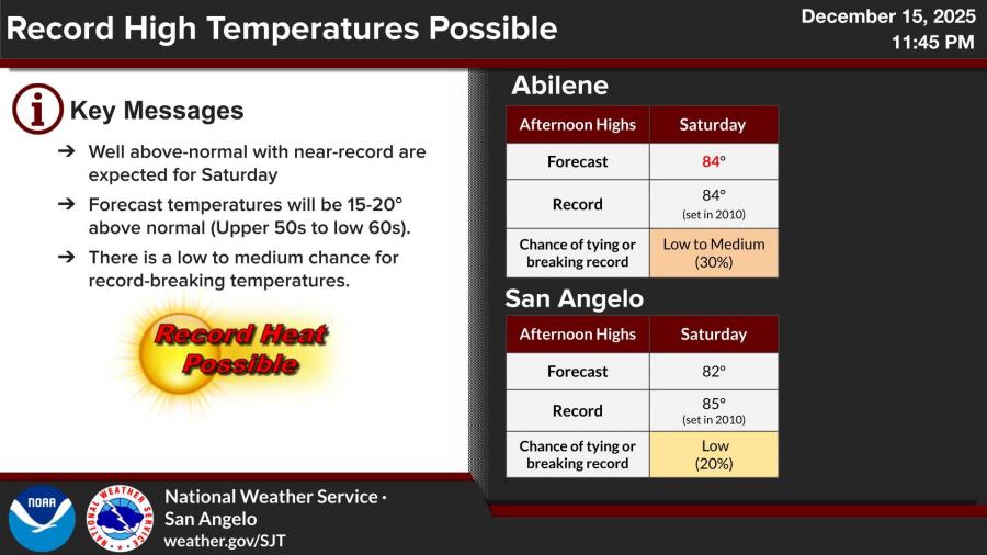In San Angelo, the forecast high for Saturday is 82 degrees. The record high for that date is 85 degrees, set in 2010, giving the city a low chance of a record being tied or broken. In Abilene, Saturday’s forecast high is 84 degrees, matching the existing record set in 2010, with a low to medium chance of a tie or new record.