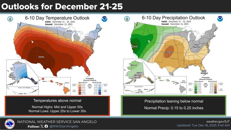 Looking ahead, the National Weather Service’s 6- to 10-day outlook for Dec. 21–25 indicates temperatures will continue to lean above normal across West Central Texas. Precipitation during that period is expected to remain below normal, with typical rainfall totals averaging between 0.15 and 0.25 inches.
