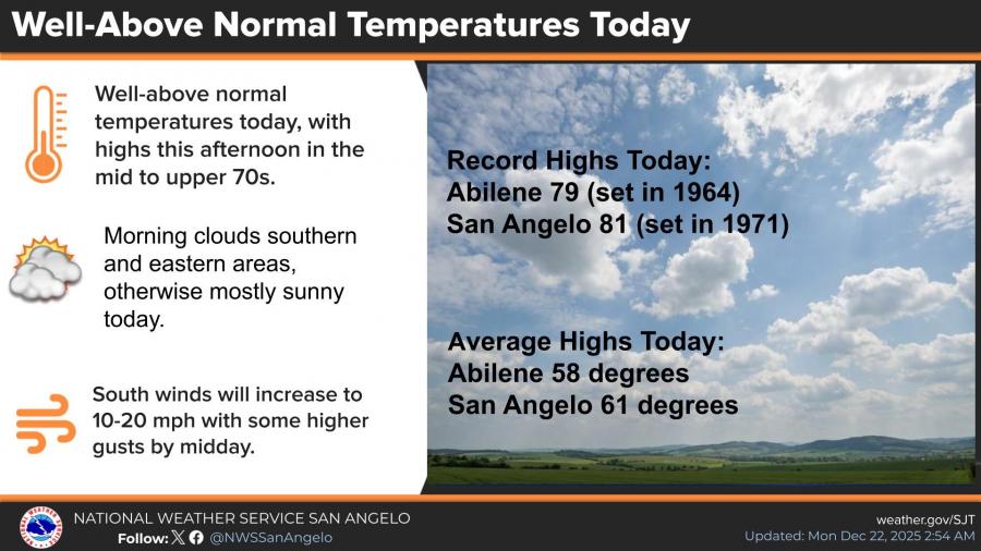 Record high temperatures may be challenged Monday, with San Angelo’s record for Dec. 22 standing at 81 degrees, set in 1971. The average high for the date is 61 degrees.