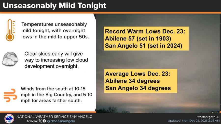 According to the National Weather Service, record warm low temperatures could also be tied or broken. For Dec. 23, the record warm low in San Angelo is 51 degrees, set in 2024, compared to an average low of 34 degrees.