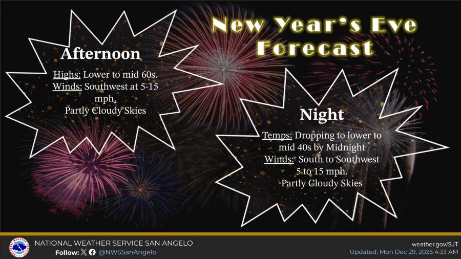 New Year’s Eve is expected to be mild, with afternoon highs in the lower to mid-60s and partly cloudy skies. Southwest winds of 5 to 15 mph are forecast during the day. Temperatures are expected to drop into the lower to mid-40s by midnight, with south to southwest winds continuing.