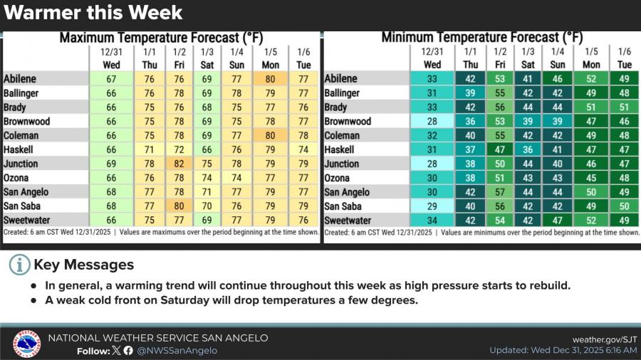 SAN ANGELO, TX — Mild and dry weather is expected across San Angelo and much of West Texas on New Year’s Eve, with afternoon highs climbing into the mid to upper 60s before temperatures fall into the lower to mid 40s by midnight, according to the National Weather Service.