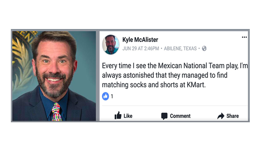 According to KTXS McAlister put out a statement on his Facebook on Tuesday saying "I use Facebook as a tool for humor. Sometimes it’s funny, sometimes it’s not. But it’s always my intention to try to bring a smile to someone’s face. It is NEVER my intention to be offensive, racist, nor divisive."