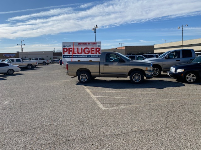 In the Republican primary, the contested races include Tom Green County Sheriff where Keith Muncey and Nick Hanna are vying to replace Sheriff David Jones who is not seeking reelection; incumbent Pct. 1 Tom Green County Commissioner Ralph Hoelscher is challenged by Cary Houston; and there are ten candidates running for CD-11 congressman including San Angeloan August Pfluger who had a supporter standing in the Keyes building. The other candidates for congress are: J.D. Faircloth, Casey Gray, J. Ross Lacy, Robert Tucker, Wesley Virdell, Gene Barber, Jamie Berryhill, Brandon Batch and Ned Luscombe. Current Cd-11 Congressman Mike Conaway is not seeking reelection.