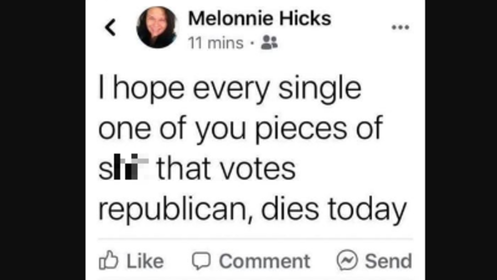 As we reported earlier, Hicks posted "I hope every single one of you pieces of s**t that votes republican, dies today."