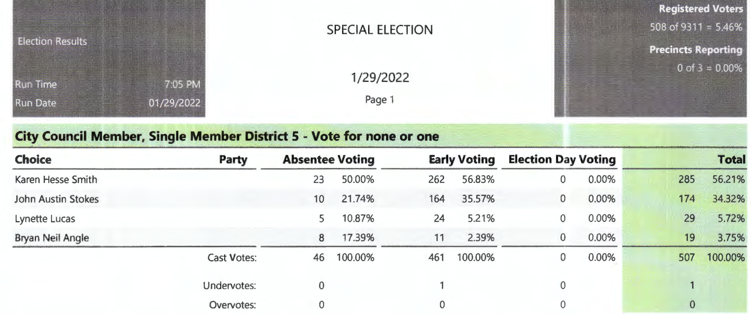 Early voting results show Karen Hesse-Smith leading with 56.83% of the 507 votes cast followed closely by John Austin Stokes.