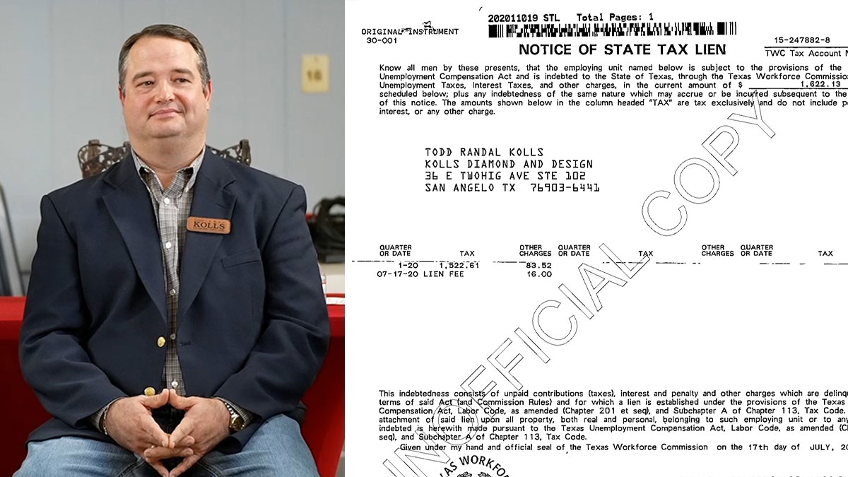 According to the Tom Green County Clerk, the Texas Workforce Commission filed a lien for $1,622.13 on July 27, 2020 on Todd Randal Kolls d/b/a Kolls Diamond and Design. The lien states that Kolls was indebted to the State of Texas through the TWC for unemployment taxes, interest taxes, and other charges.