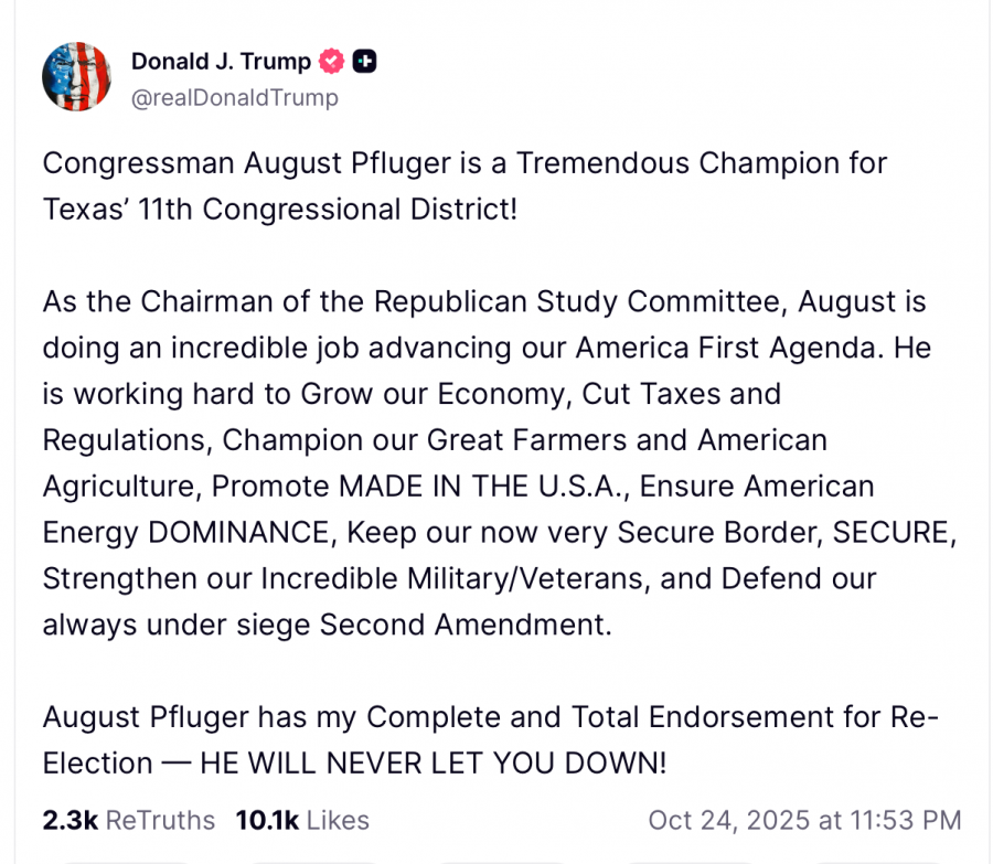 WASHINGTON, DC — President Donald J. Trump posted the following on Truth Social in strong support of Congressman August Pfluger (TX-11). See the post here or read it below.