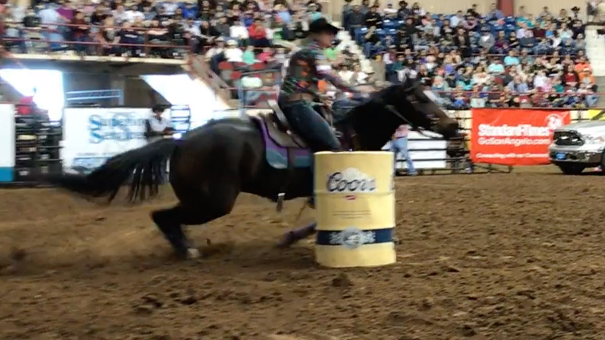 She held on pretty well, circling the cloverleaf pattern Sunday afternoon at the San Angelo Stock Show and Rodeo in a rodeo-best 13.99 seconds. She owns the second-round lead and also sits No. 1 in the average with a cumulative time of 29.90 seconds on two runs. It’s all been a whirlwind since she took a nasty spill last weekend in Fort Worth, Texas.
